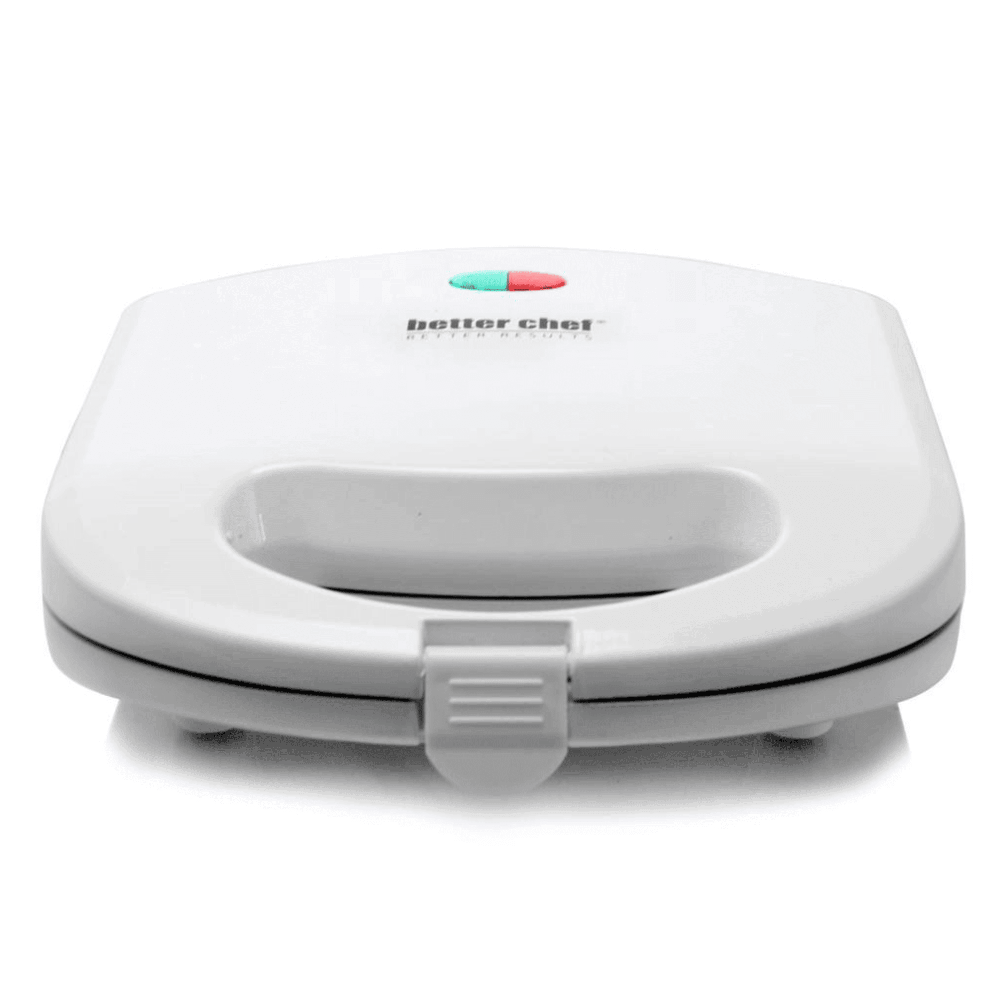 This Better Chef double sandwich maker features a non-stick cooking surface, facilitating easy cleanup after use. It can grill up to 2 sandwiches or hot pockets within minutes, offering a quick and convenient meal option. When not in use, it stands upright for easy storage, saving space in your kitchen. On/Off/Ready indicators provide clear signals during the cooking process. Additionally, it boasts a cool-touch exterior, ensuring safe handling even when in operation. The cord storage feature helps keep the cord neatly organized when the sandwich maker is not in use, further contributing to its convenience and tidy appearance on the countertop.
