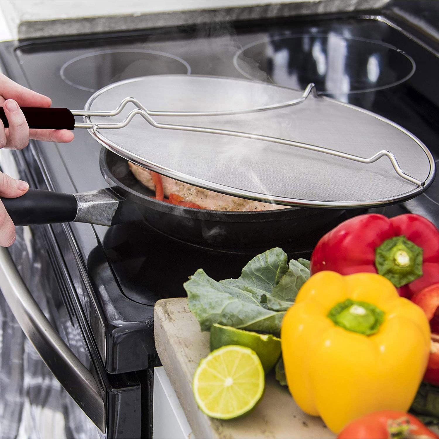 *Multi-Usage*:Made from a rust-proof fine wire mesh screen with a durable thick twill weave,our Grease Splatter Screen can be used as a fine mesh strainer,steamer,a cooling rack and also used as a splatter screen guard to avoid the dangers of hot oil,grease,boiling water and food particles from splattering.