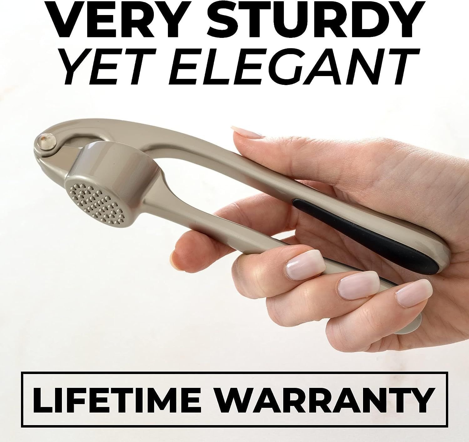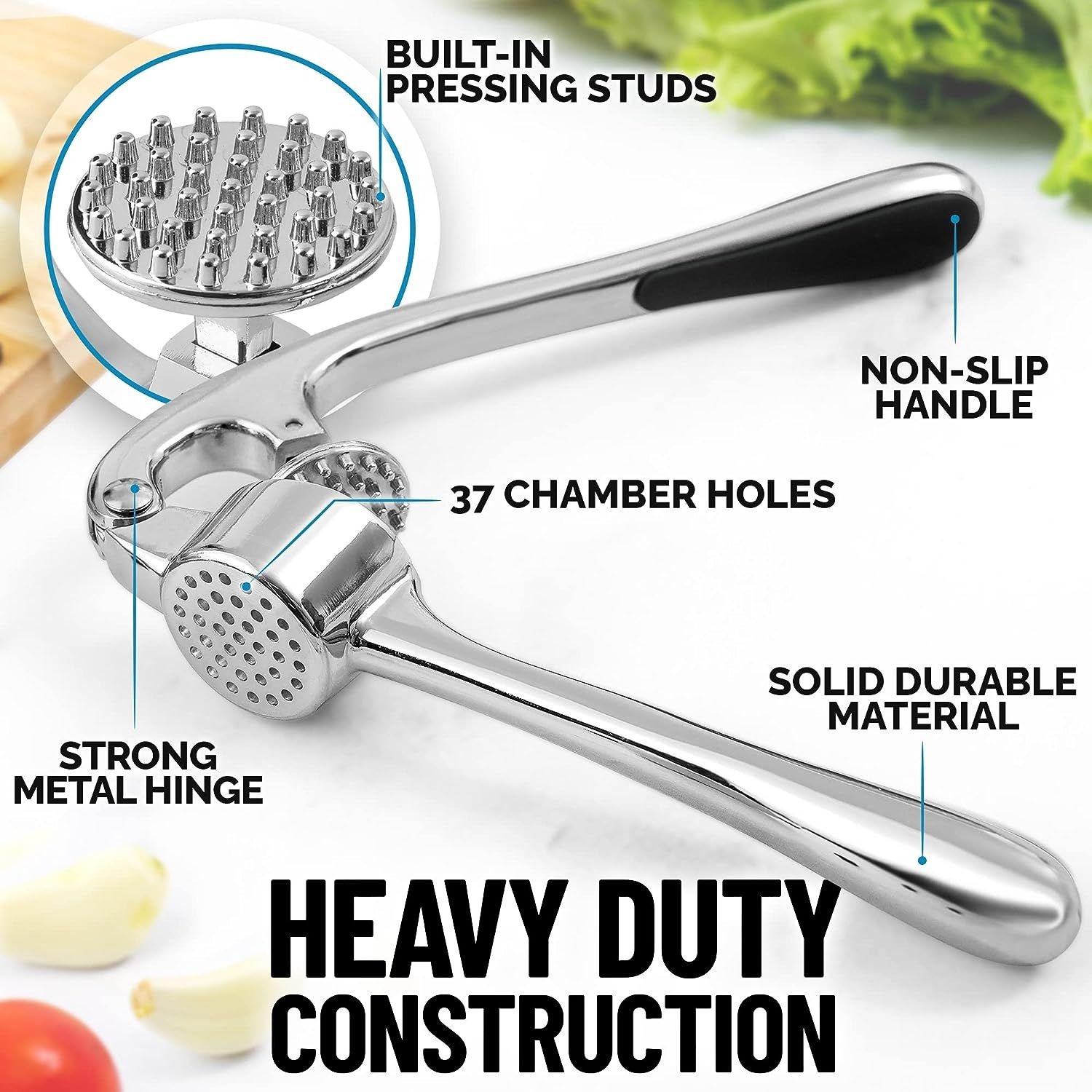High quality garlic press with soft easy squeeze ergonomic handle, sturdy design extracts more cloves per clove, garlic crusher for nuts and seeds