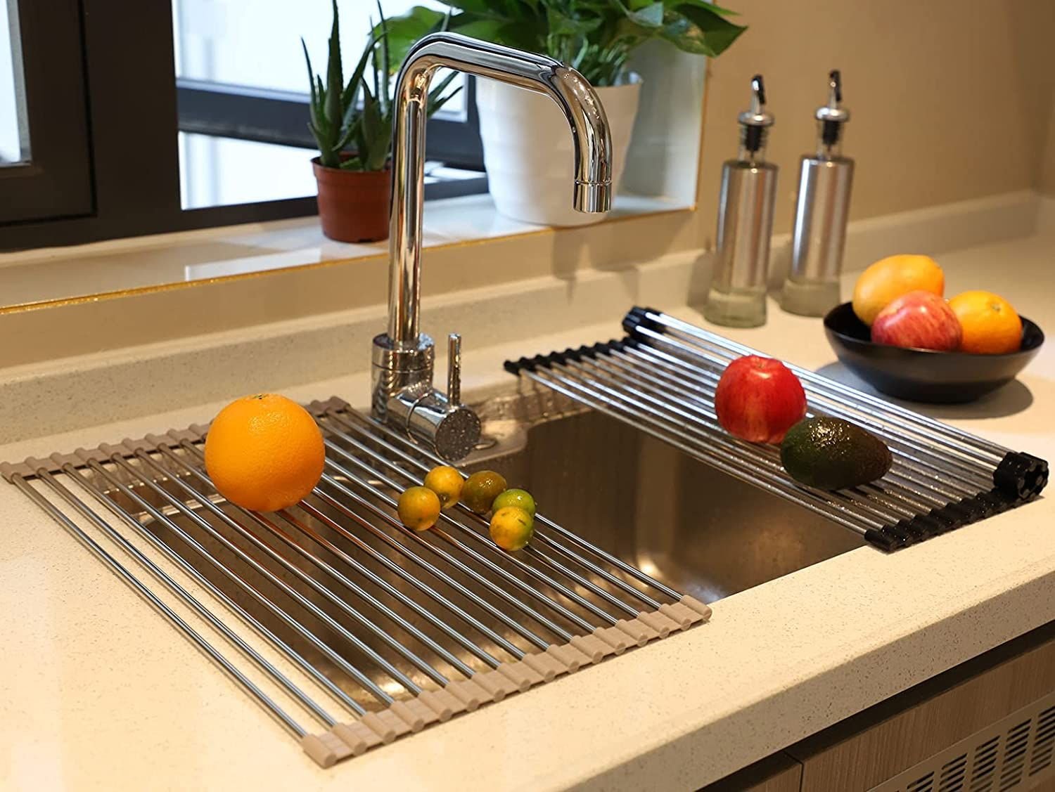 Multi-use Folding Dish Drying Rack: This roll up drying rack unrolls above an open sink for air-drying washed dishes, for additional counter top space, or as a trivet. Vegetable and fruit dish drainers, great kitchen dish racks for counter.