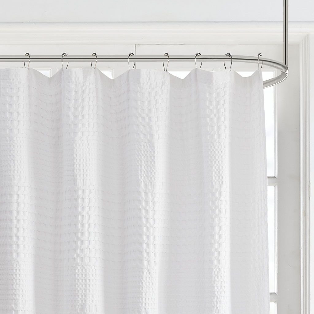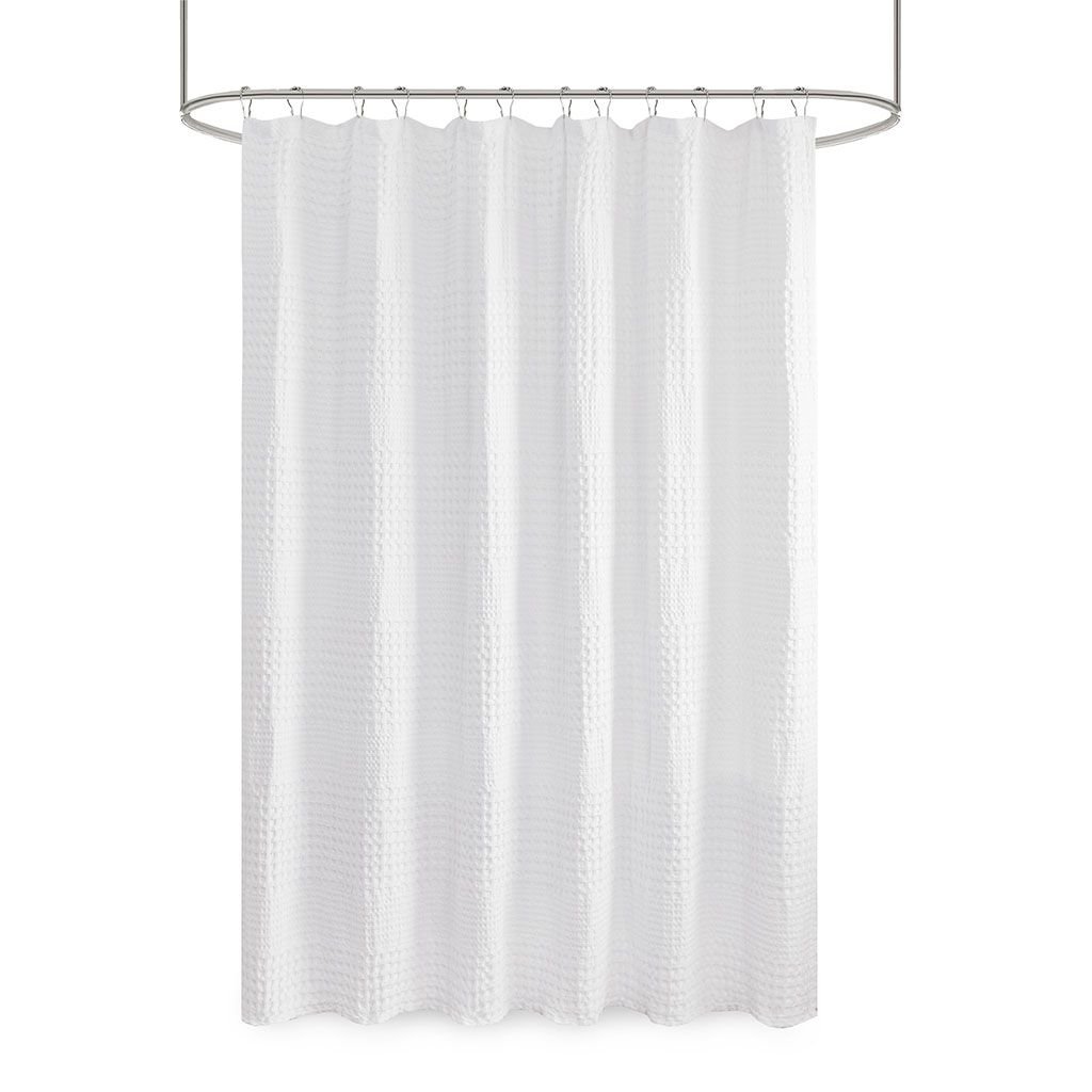 Give your bathroom a spa-like allure with the Madison Park Arlo Super Waffle Textured Solid Shower Curtain. This solid White shower curtain features a heavy waffle weave base fabric that creates a rich texture for a simple and stylish update. The medium weight fabric allows a natural and rich drapability, while the 100% cotton provides the perfect natural touch. Each shower curtain is machine washable for easy care and finished with 12 button holes at the top, making it easy to attach hooks and hang on rod (hooks and rod not included). A water repellant liner is not included, but highly recommended to ensure the best care and handling of this rich medium weight shower curtain. Coordinates perfectly with the Madison Park 800 GSM Bath Towel Collection.