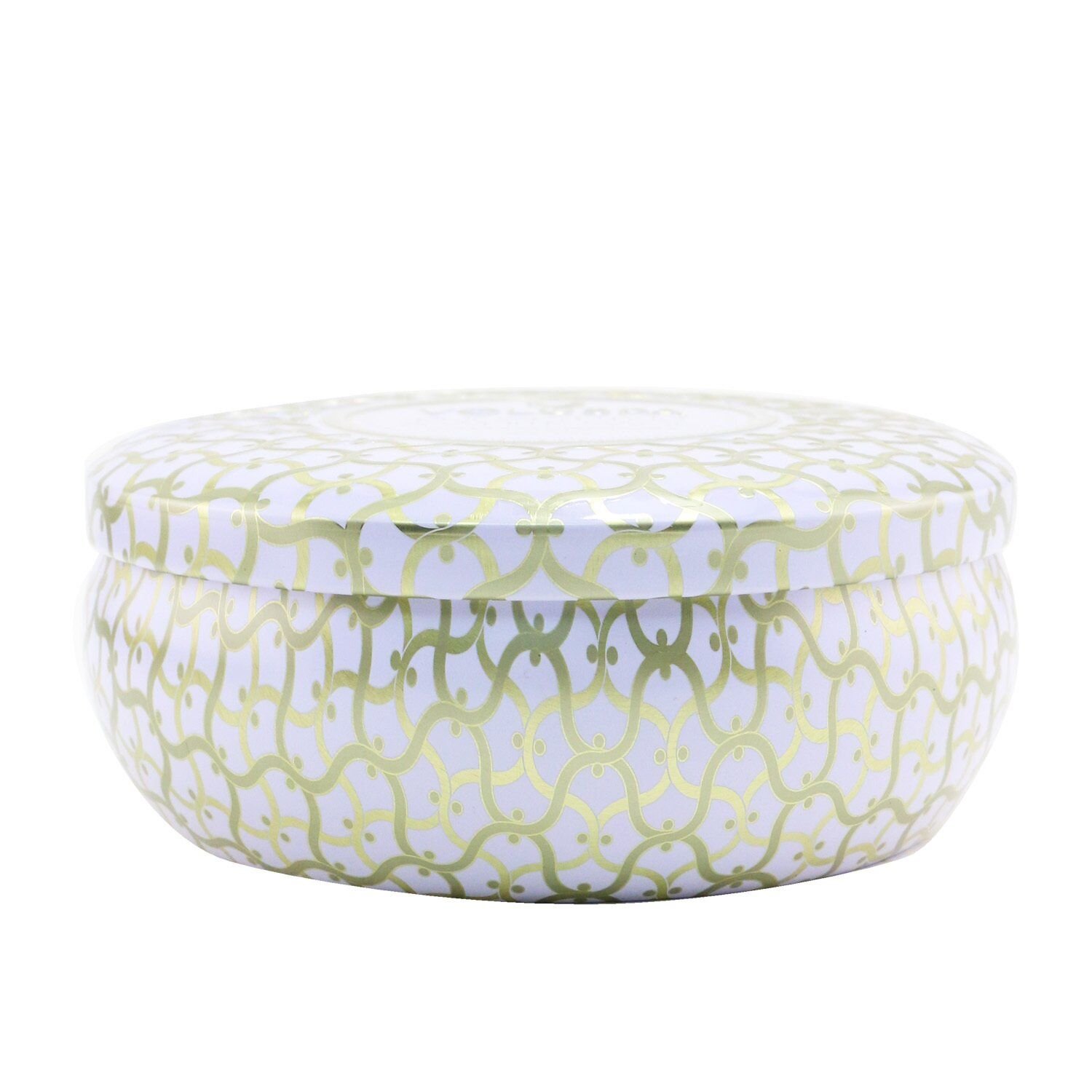 A highly decorative, heavenly-scented tin candleMade with proprietary coconut wax blend with three cotton wicksWarms your space with a soft, inviting fragranceDimensions: 5.31" D x 2.36" HBurn time is approximately 40 hoursHoused in a beautifully patterned metallic tin adorned with rich jewel tonesHand-poured in the U.S.A.Free of phthalates, parabens, sulfates & animal testingCaution: Burn on a heat resistant surface. Do not drop foreign matter or wick-trimmings into candle. Burn in an open area away from drafts. Keep candle burning within sight. Keep out of reach of children & pets